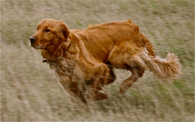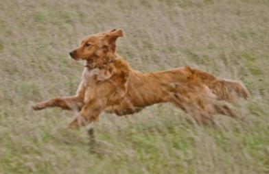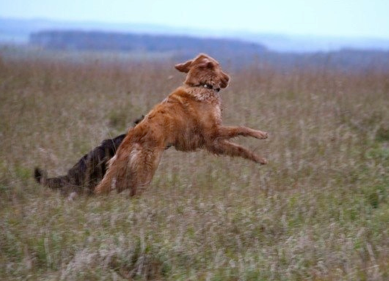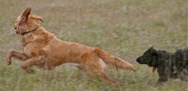 Amber is great in the car, walks well on a lead and is happy to be with anyone as long as she can be close to you. She has great skills with other dogs (they all think she’s lovely). She is a bit of a play-pest at the mo with dogs that won’t tell her off, but this will settle down. (The pix here show her playing with pocket rocket Tara on Salisbury Plain.) She has lots of energy - expected given the setter bit of her. But, to our slight surprise (she’s blonde, you see...), Amber is also a really bright girl. She picks up things very quickly and is keen to learn. She also asks questions (“Why exactly do you want me to stay behind this child gate..?”) and can be a little whingey when she doesn’t get her own way. She’s not, incidentally, fully housetrained yet.