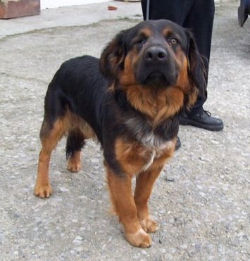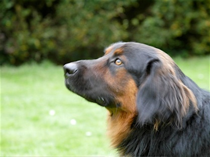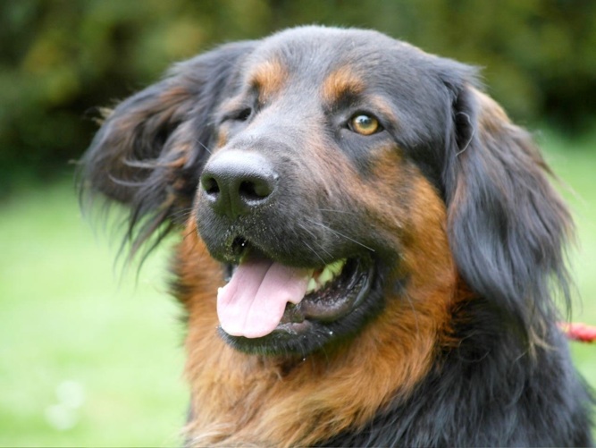 Yogi is a fabulous dog - young, affectionate and great with people and other dogs. He looks like a GSD/collie x; others have suggested newfoundland/gordon setter. But, actually, he also looks very like a hovawart. But whatever his ancestry, he is retrievery in nature and has traffic-stopping good looks. Only having eye does not, of course, hold him up at all.